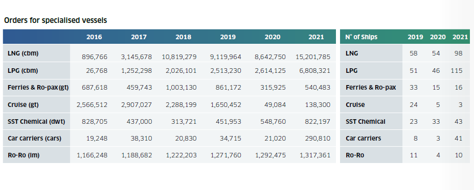 同時(shí),去年除郵輪外的特種船市場表現(xiàn)十分活躍。2021年LNG船新船訂單量達(dá)到98艘1520萬立方米,其中12艘為LNG加注船。LPG船訂單量也達(dá)到了創(chuàng)紀(jì)錄的135艘。不銹鋼化學(xué)品船和汽車運(yùn)輸訂單量均高于前幾年,而郵輪訂單幾乎消失。