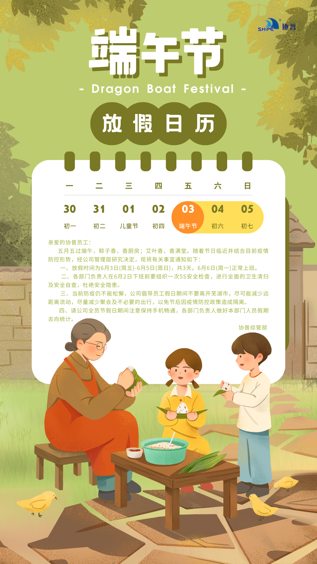 值此端午佳節(jié)來臨之際,協(xié)普全體員工將于6月3日至6月5日放假三天。
