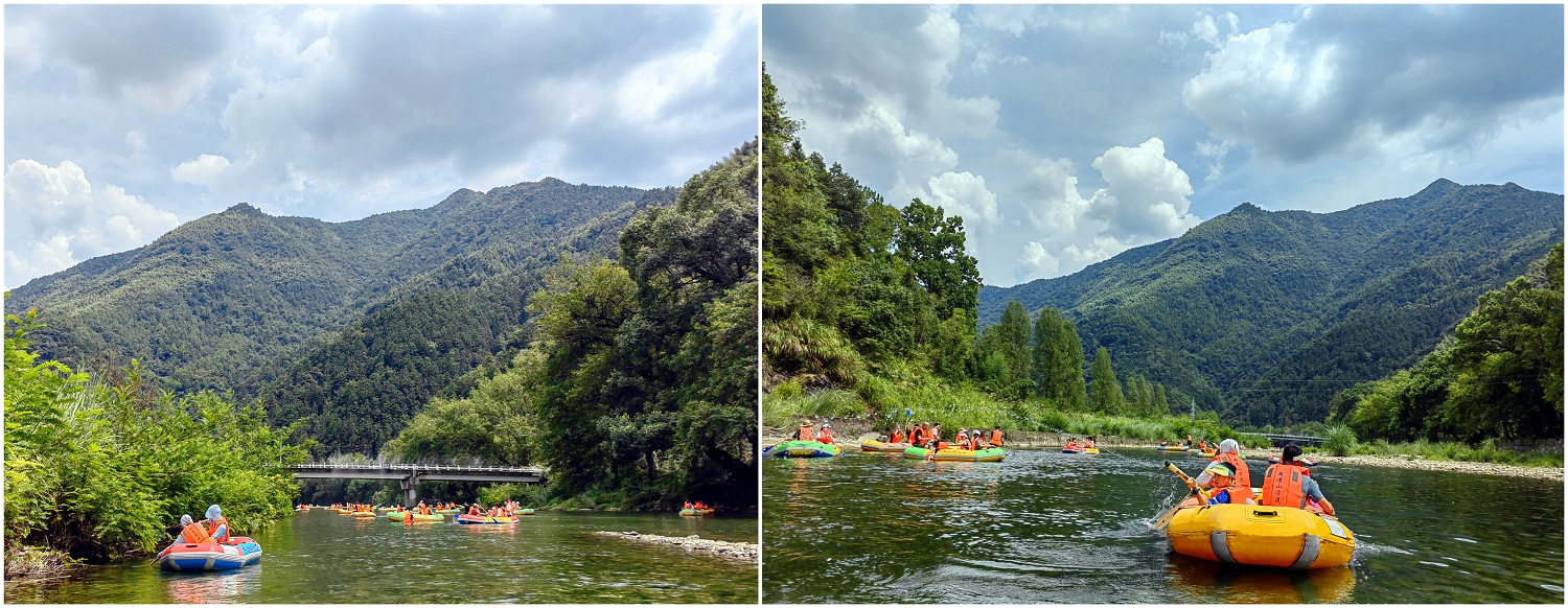 此次行程兩天一夜,在導(dǎo)游的帶領(lǐng)之下,我們首先來到石臺縣大演鄉(xiāng)剡溪村的西黃山漂流景區(qū)。下榻之時,正值正午時分,景點兩岸青山疊嶂、風(fēng)光旖旎、草木蔥蘢、景色怡人。協(xié)普家人們換好服裝,穿上救生衣,在工作人員的協(xié)助之下,或一家?guī)卓凇⒒蛉搴糜呀Y(jié)伴乘筏而行、泛舟漂流,水面波光瀲滟、河底各式各樣的鵝卵石靜靜地躺著,日復(fù)一日被溪水沖刷,變得光滑又圓潤,坐在游筏里俯身去看,“瞧,有不少小魚正悠閑地在它的身上游過呢”,其水之清澈由此可見一斑。此次漂流全程3公里,在漂流過程中,除了欣賞到秀美的湖光山色,體驗到劈波斬浪的沖刺暢快感,更讓人愜意的是,在河灘淺水區(qū)域漂流回緩,協(xié)普家人們正帶著孩子們,在這悠閑的時光里愉快的打起了水仗,孩子們帶上了自己心愛的水槍玩起了水槍大戰(zhàn),有人帶來了水盆和水瓢,于是乎水槍大戰(zhàn)現(xiàn)場演變成了潑水節(jié),歡笑聲、尖叫聲蕩漾在山谷之間,在這愜意的時光里,平日的壓力和煩擾仿佛已煙消云散。