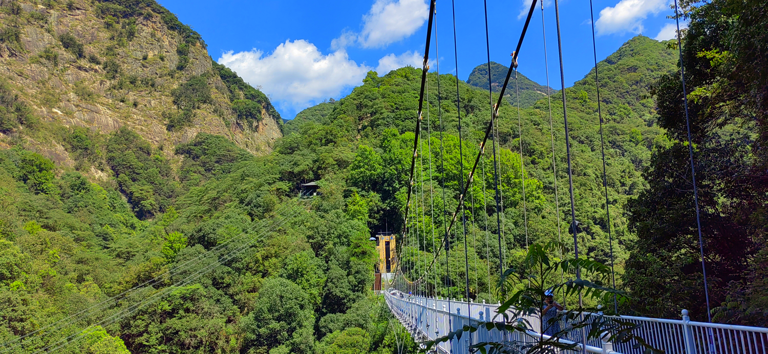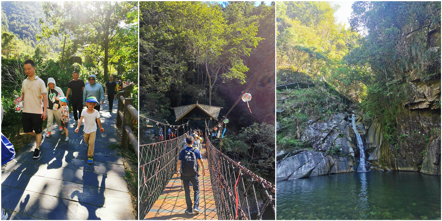 晚上體驗了農(nóng)家樂菜肴和當(dāng)?shù)靥厣袼藓?,第二天早早的起床,吃完早餐集合,大家興致勃勃地乘著大巴來到了醉山野景區(qū),這里是安徽省內(nèi)第一個5D玻璃橋皖南地區(qū)最大的瀑布群。在進入景區(qū)之前,有一段鄉(xiāng)村道路,徒步的過程頂著早上八九點的太陽就覺得酷暑難耐,然而當(dāng)我們正式踏入景點,走在山谷間的步棧道上,遠(yuǎn)處是蔥郁的山林、近處是流動的溪水、頂上是一片陰涼,只聽見大朋友們小朋友們都在說“好涼快啊,好涼快?。 毖刂綏5览^續(xù)前行,來到了千花橋,這里是著名的網(wǎng)紅打卡點,小朋友們都絡(luò)繹不絕的脫下鞋子、挽起褲腳,下水嬉戲游玩。有合影拍照的、有撿起小石片仍水花的、還有在石頭縫里抓螃蟹的。大家坐在陰涼的石頭塊上休憩閑聊,甚至玩笑起來,富硒山水、天然氧吧,以后老了退隱山林一定要來這里休養(yǎng)生息。有人不被沿途風(fēng)景耽誤過久,繼續(xù)往山上攀爬,他們到了山頂穿過了玻璃棧橋,體驗了“一覽眾山小”的視野和格局。由于兩個月沒有下雨,雖有山谷溪流卻看不到震撼的黃崖瀑布群,實屬遺憾,卻也給大家下次再來此一游留下了機會。